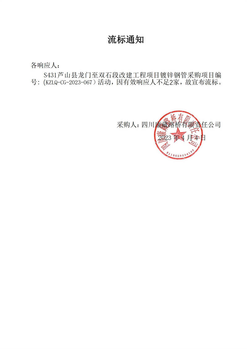 四川康藏路橋有限責(zé)任公司S431蘆山縣龍門至雙石段改建工程項(xiàng)目鍍鋅鋼管采購流標(biāo)通知
