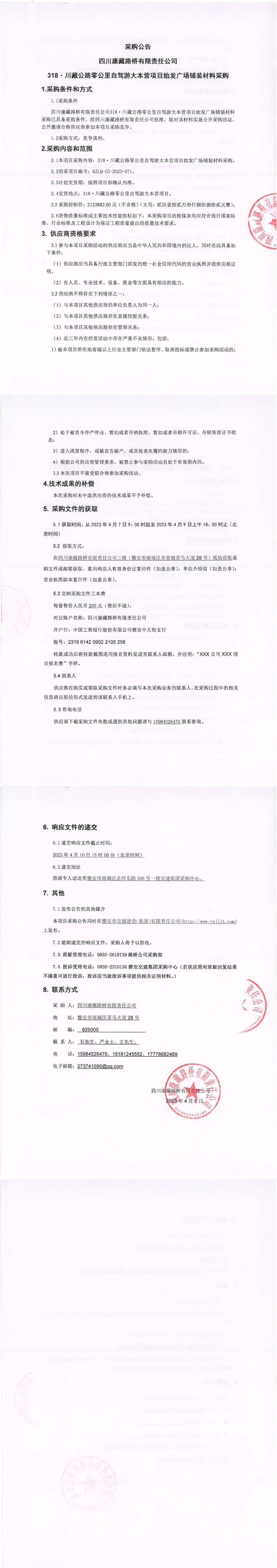 四川康藏路橋有限責(zé)任公司318·川藏公路零公里自駕游大本營項目始發(fā)廣場鋪裝材料采購公告