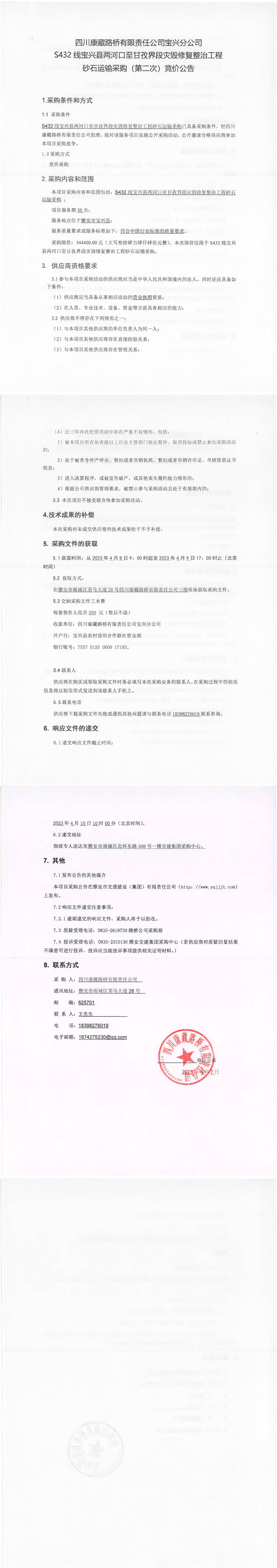 四川康藏路橋有限責(zé)任公司寶興分公司S432寶興縣兩河口至甘孜界段災(zāi)毀修復(fù)整治工程砂石運輸采購(第二次)競價公告