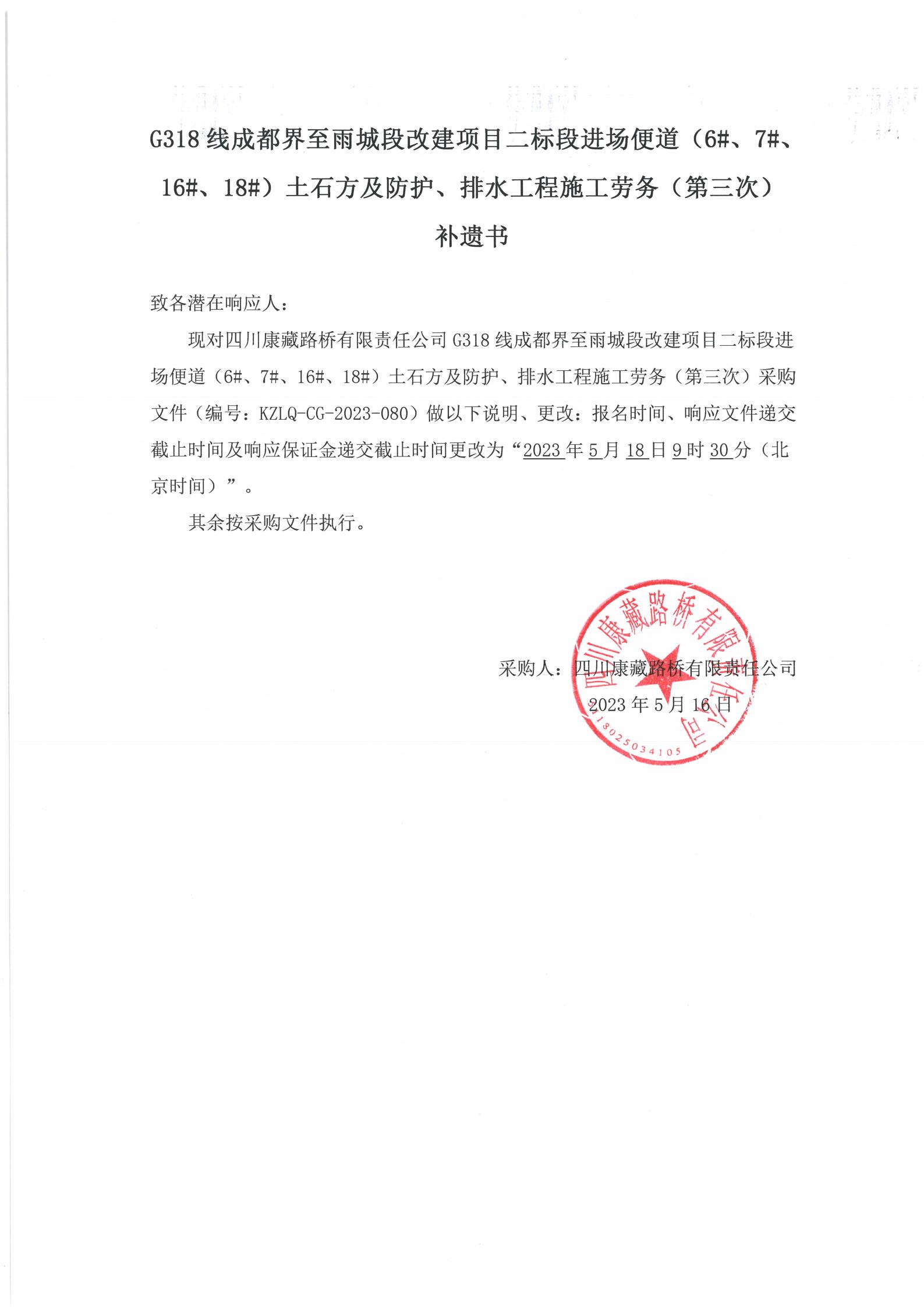 四川康藏路橋有限責(zé)任公司G318線成都至雨城段改建項目二標(biāo)段進(jìn)場便道(6#、7#、16#、18#)土石方及防護(hù)、排水工程施工勞務(wù)(第三次)補(bǔ)遺書