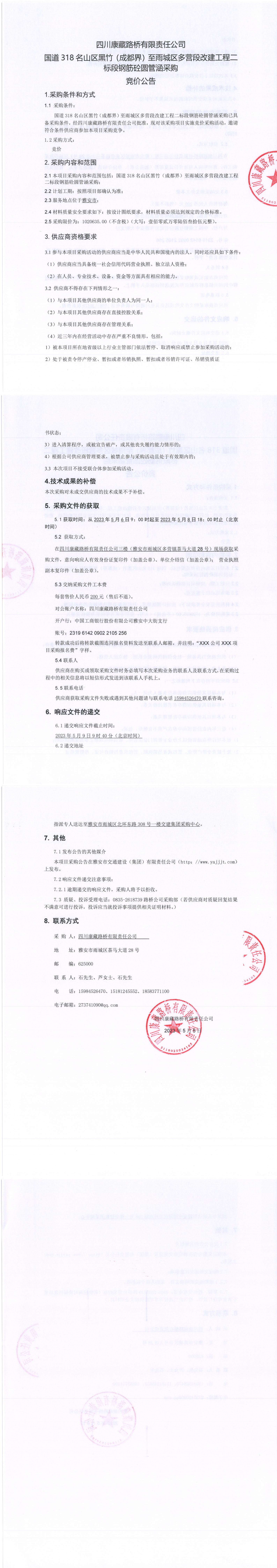 四川康藏路橋有限責(zé)任公司國(guó)道318名山區(qū)黑竹(成都界)至雨城區(qū)多營(yíng)段改建工程二標(biāo)段鋼筋砼圓管涵采購(gòu)競(jìng)價(jià)公告