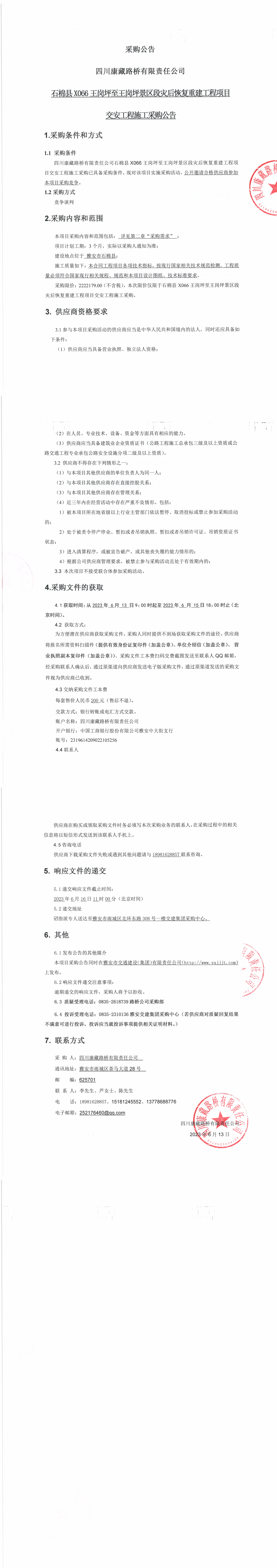 四川康藏路橋有限責(zé)任公司石棉縣X066王崗坪至王崗坪景區(qū)段災(zāi)后恢復(fù)重建工程項目交安工程施工采購公告