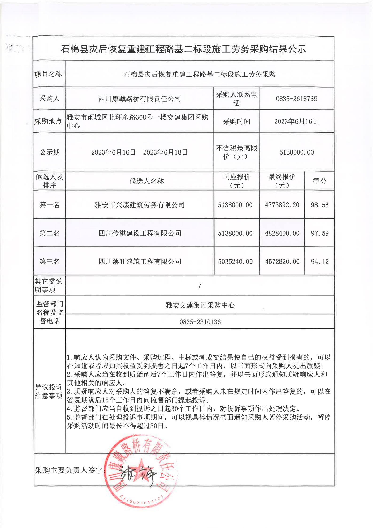 四川康藏路橋有限責(zé)任公司石棉縣災(zāi)后恢復(fù)重建工程路基二標(biāo)段施工勞務(wù)采購結(jié)果公示