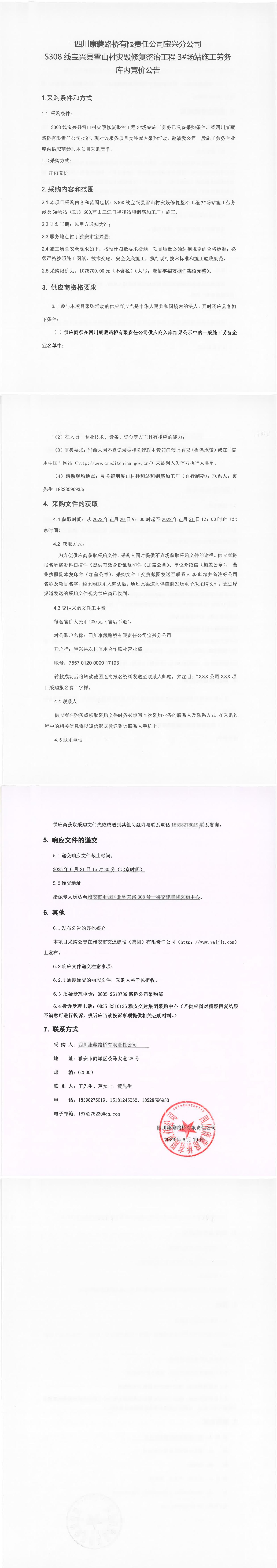 四川康藏路橋有限責(zé)任公司寶興分公司S308線寶興縣雪山村災(zāi)毀整治工程3#場站施工勞務(wù)庫內(nèi)競價(jià)公告