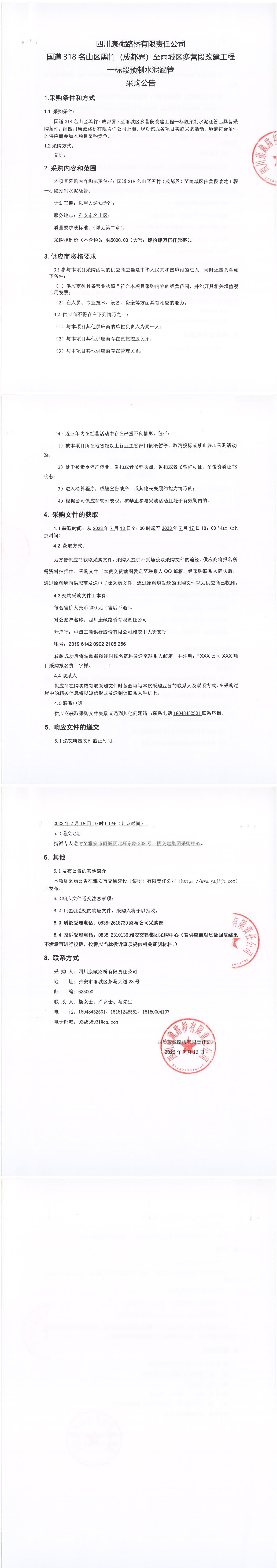 四川康藏路橋有限責(zé)任公司國道318名山區(qū)黑竹(成都界)至雨城區(qū)多營段改建工程一標(biāo)段預(yù)制水泥涵管采購公告