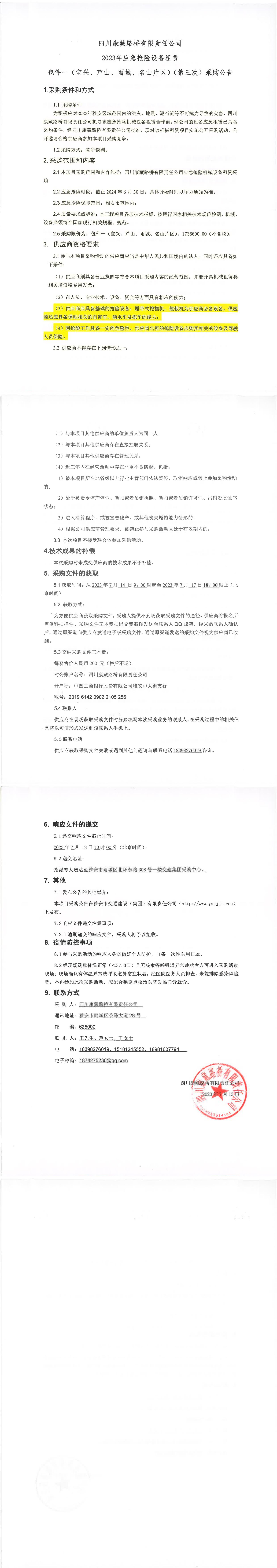 四川康藏路橋有限責(zé)任公司2023年應(yīng)急搶險設(shè)備租賃包件一(寶興、蘆山、雨城、名山片區(qū))(第三次)采購公告