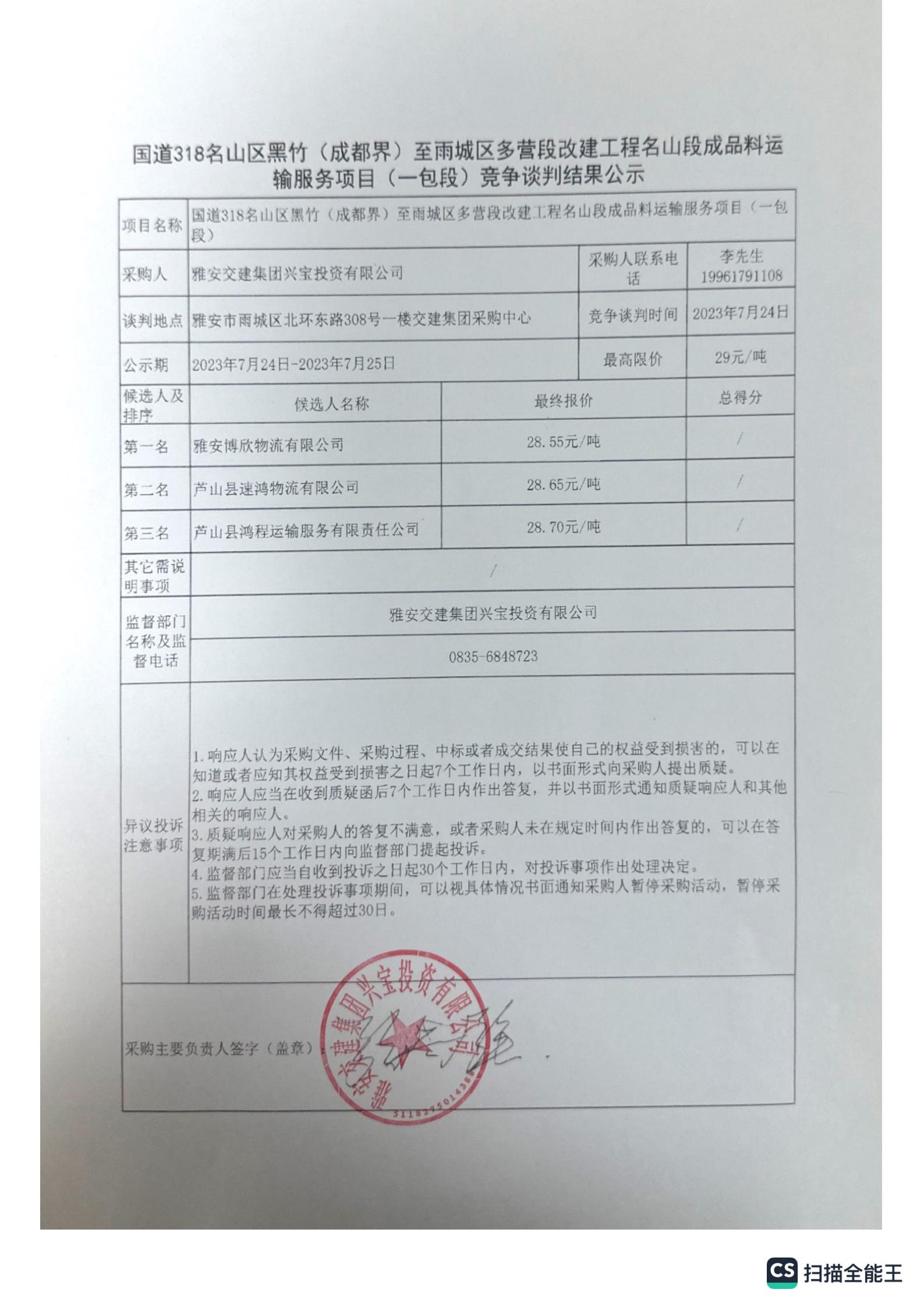 雅安交建集團(tuán)興寶投資有限公司國(guó)道318名山區(qū)黑竹(成都界)至雨城區(qū)多營(yíng)段改建工程名山段成品料運(yùn)輸服務(wù)項(xiàng)目(二包段)競(jìng)爭(zhēng)談判結(jié)果公示
