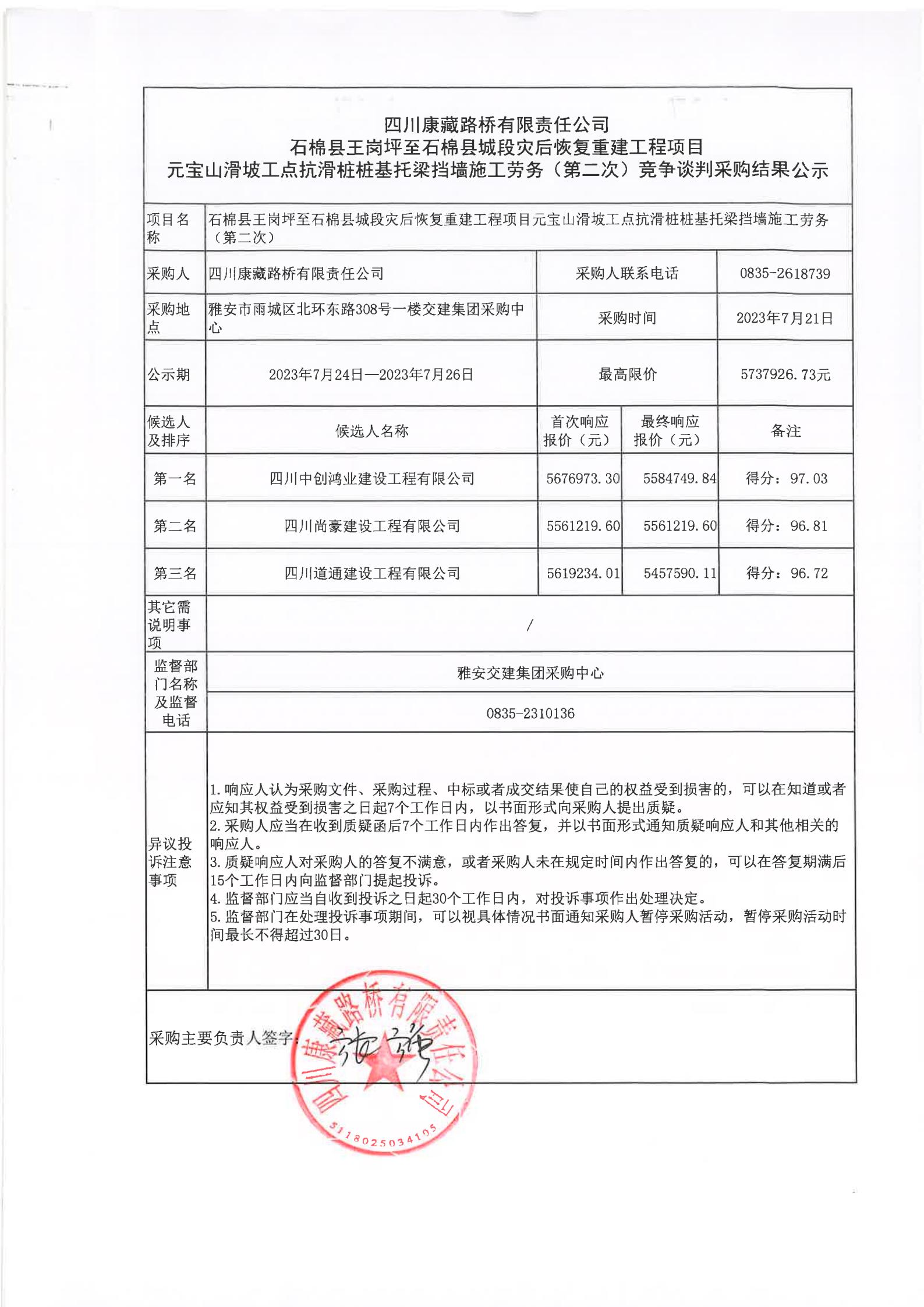 四川康藏路橋有限責(zé)任公司石棉縣王崗坪至石棉縣城段災(zāi)后恢復(fù)重建工程項(xiàng)目元寶山滑坡工點(diǎn)抗滑樁樁基托梁擋墻施工勞務(wù)(第二次)競爭談判采購結(jié)果公示