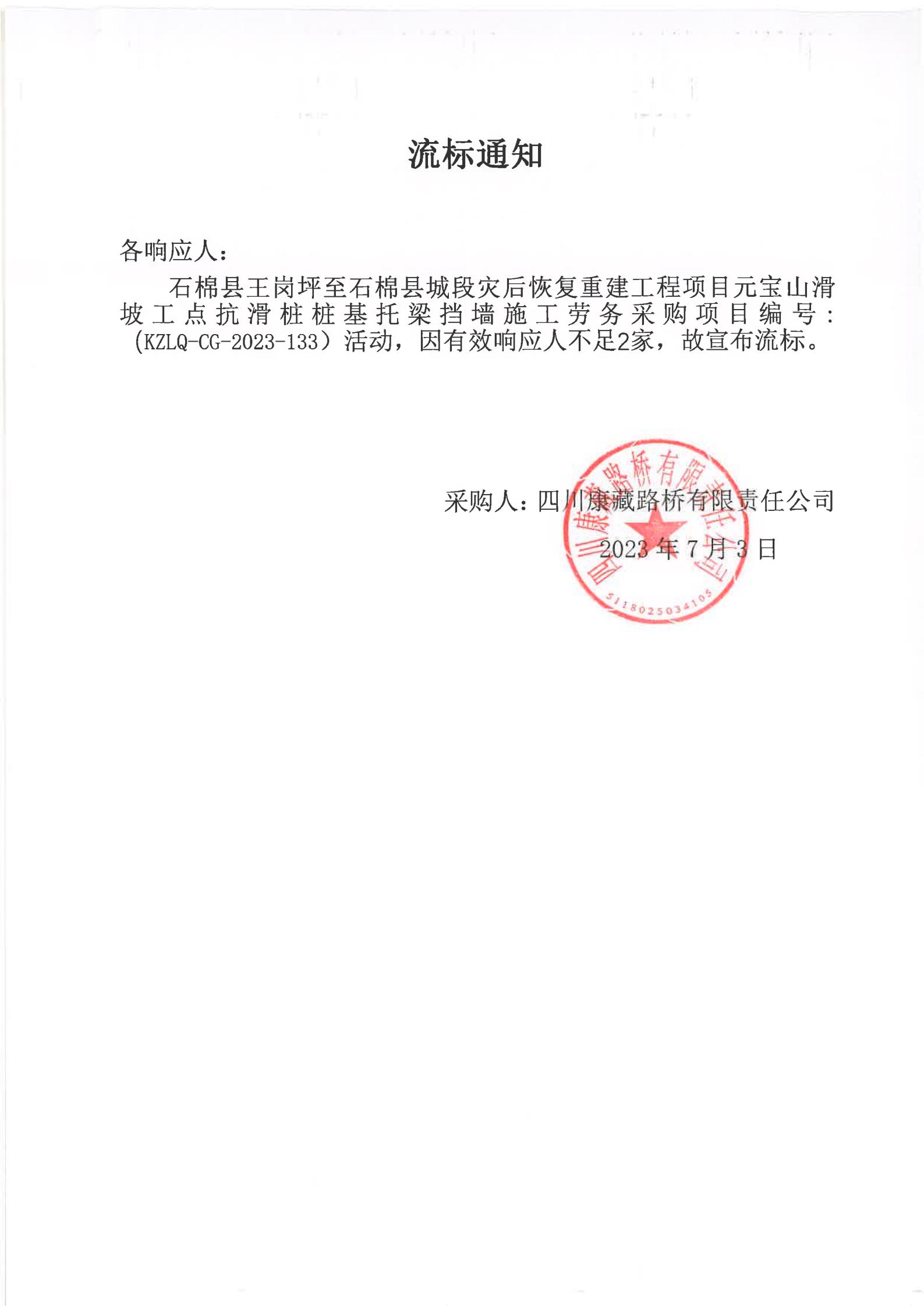 四川康藏路橋有限責(zé)任公司石棉縣王崗坪至石棉縣城段災(zāi)后恢復(fù)重建工程項目元寶山滑坡工點抗滑樁樁基托梁擋墻施工勞務(wù)采購流標通知