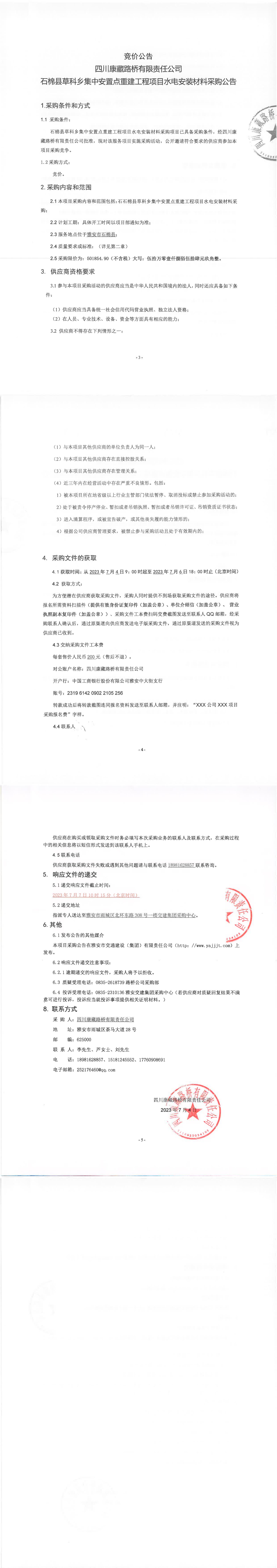 四川康藏路橋有限責(zé)任公司石棉縣草科鄉(xiāng)集中安置點(diǎn)重建工程項(xiàng)目水電安裝材料采購(gòu)公告