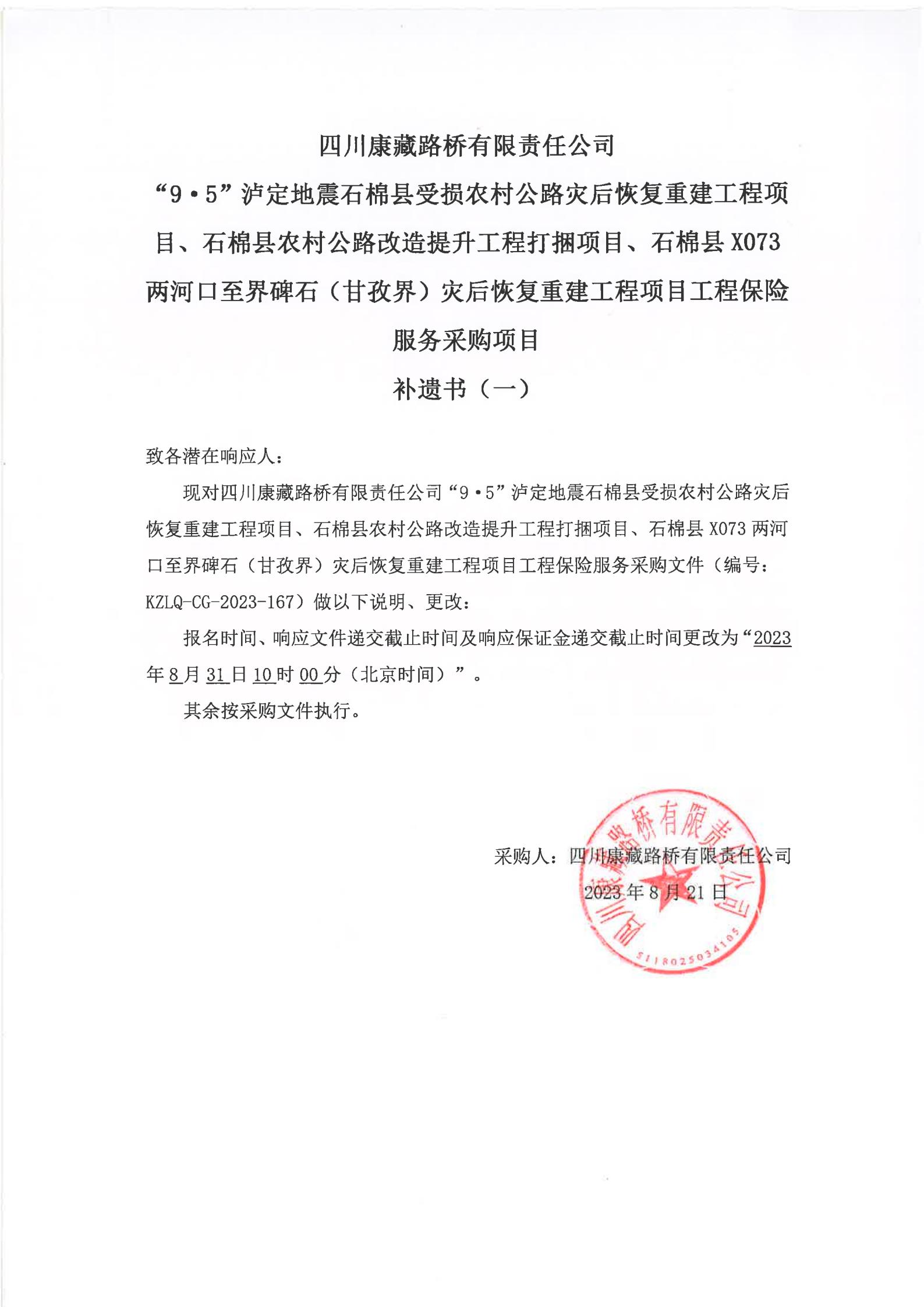 四川康藏路橋有限責任公司“9·5”瀘定地震石棉縣受損農村公路災后恢復重建工程項目、石棉縣農村公路改造提升工程打捆項目、石棉縣X073兩河口至界碑石(甘孜界)災后恢復重建工程項目工程保險服務采購項目補遺書(一)