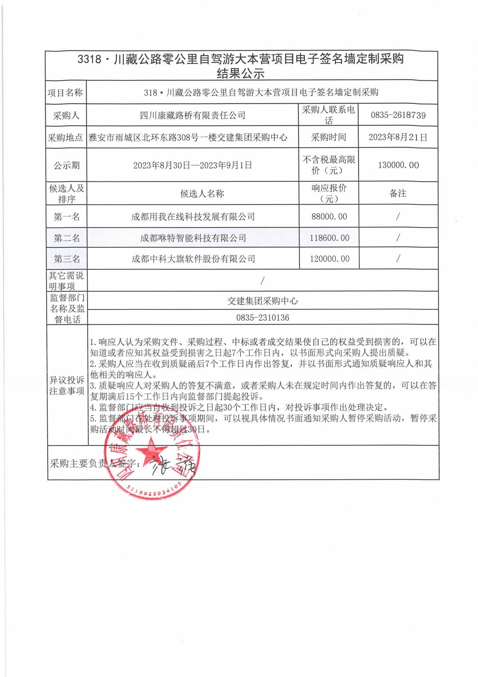 四川康藏路橋有限責(zé)任公司318·川藏公路零公里自駕游大本營(yíng)項(xiàng)目電子簽名墻定制采購(gòu)結(jié)果公示