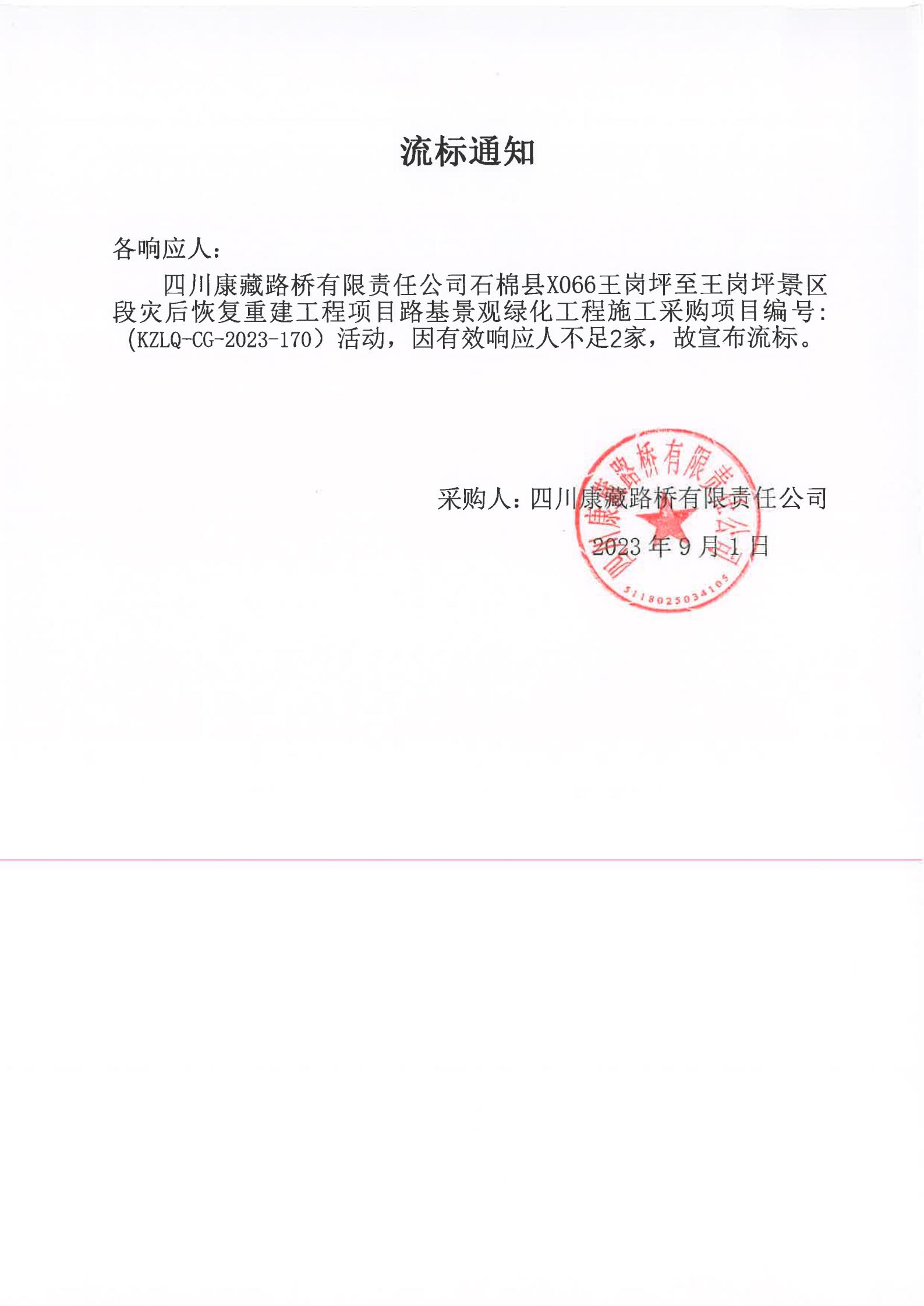 四川康藏路橋有限責(zé)任公司石棉縣X066王崗坪至王崗坪景區(qū)段災(zāi)后恢復(fù)重建工程項(xiàng)目路基景觀(guān)綠化工程施工采購(gòu)流標(biāo)通知