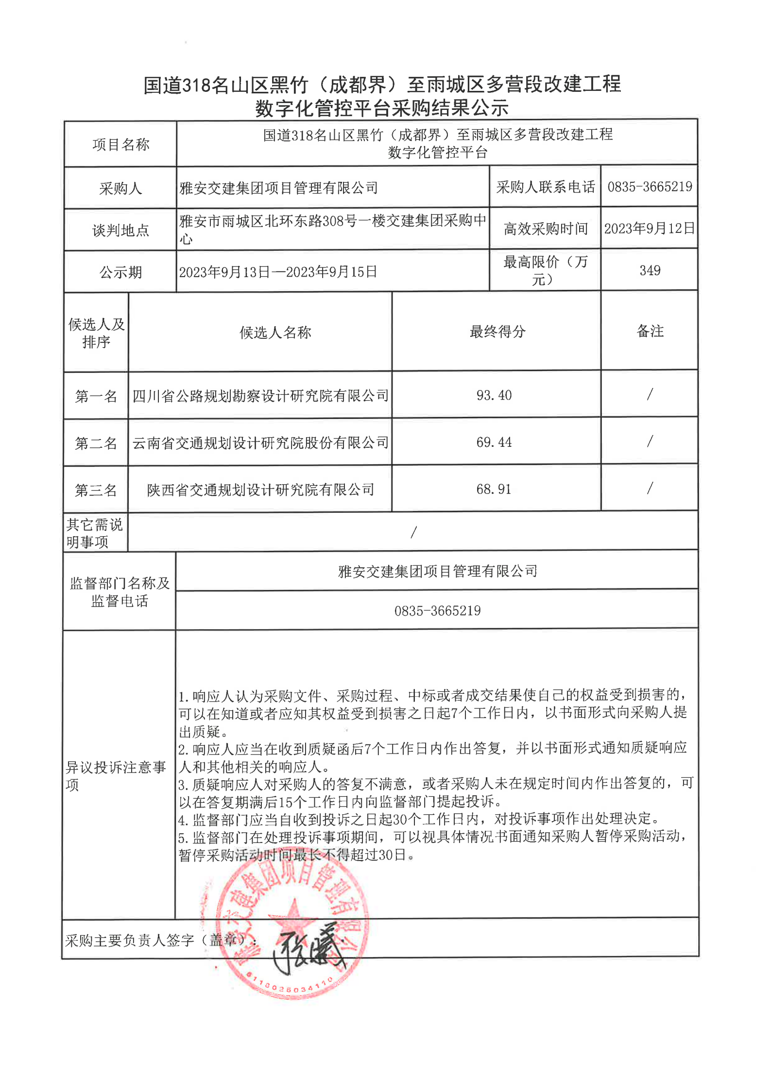 雅安交建集團項目管理有限公司國道318名山區(qū)黑竹(成都界)至雨城區(qū)多營段改建工程數(shù)字化管控平臺采購結果公示