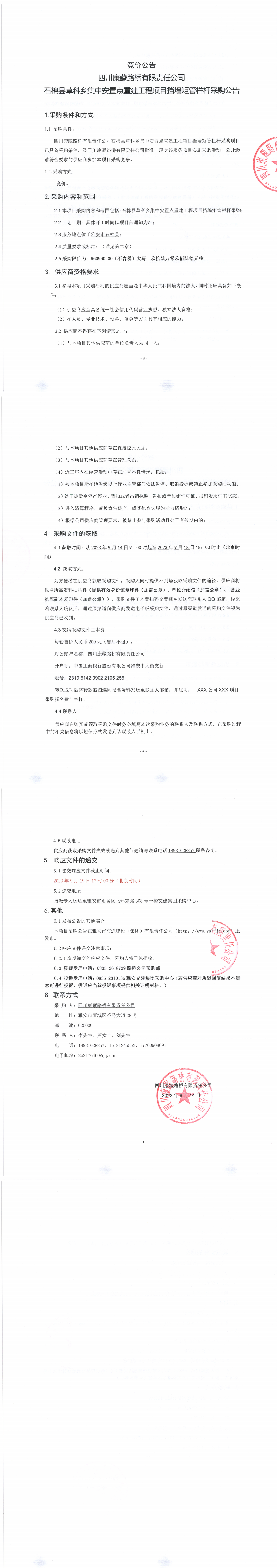 四川康藏路橋有限責任公司石棉縣草科鄉(xiāng)集中安置點重建工程項目擋墻矩管欄桿采購公告