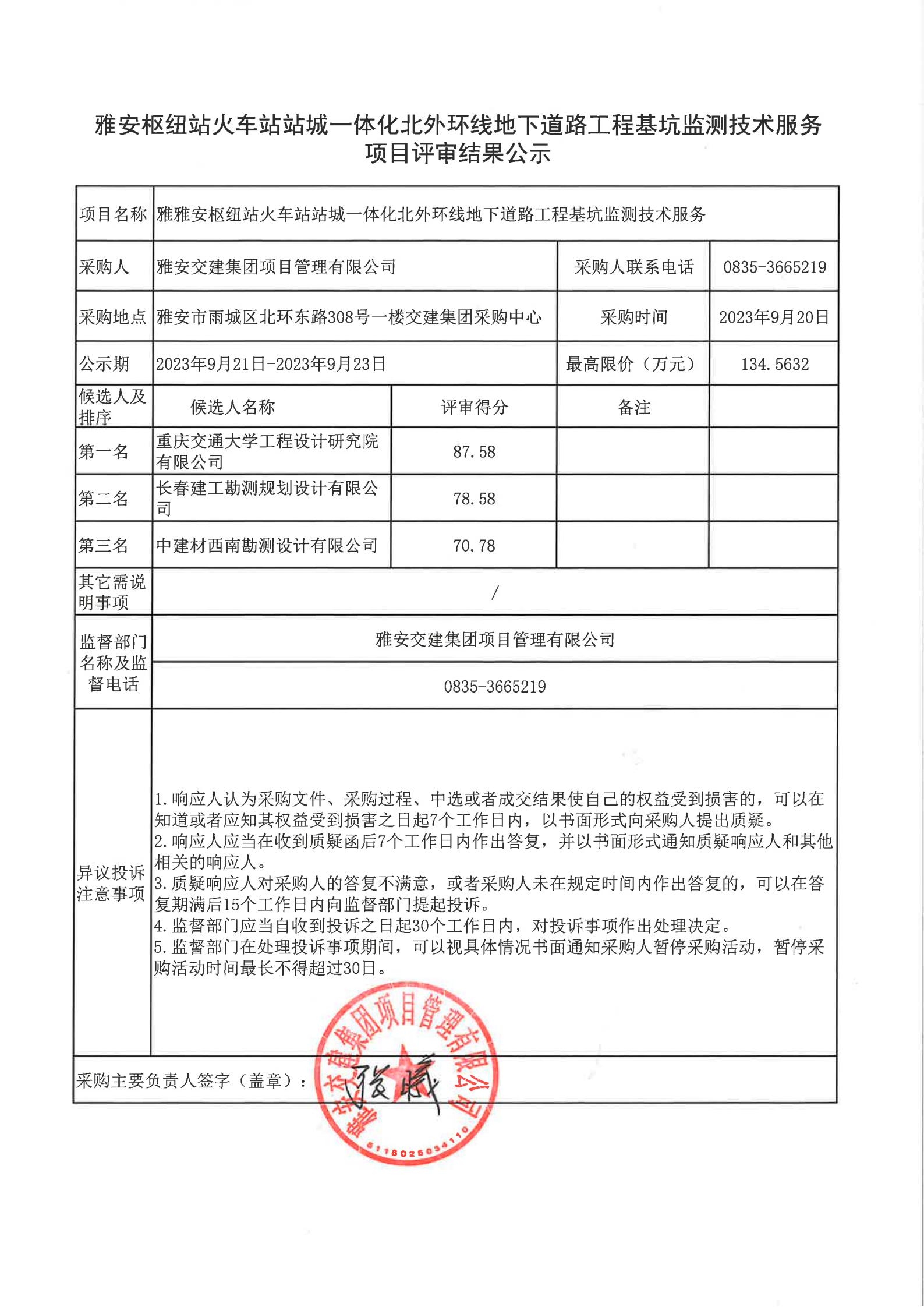 雅安交建集團項目管理有限公司雅安樞紐站火車站站城一體化北外環(huán)線地下道路工程基坑監(jiān)測技術(shù)服務(wù)項目評審結(jié)果公示