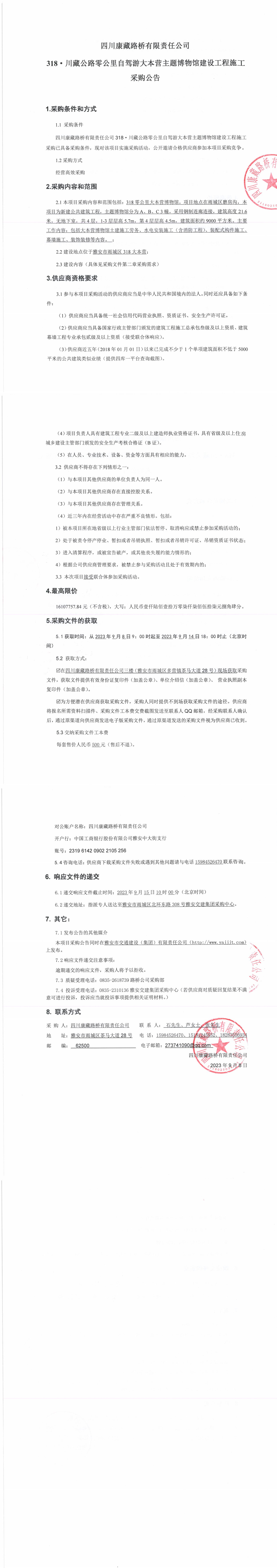 四川康藏路橋有限責任公司318·川藏公路零公里自駕游大本營主題博物館建設工程施工采購公告