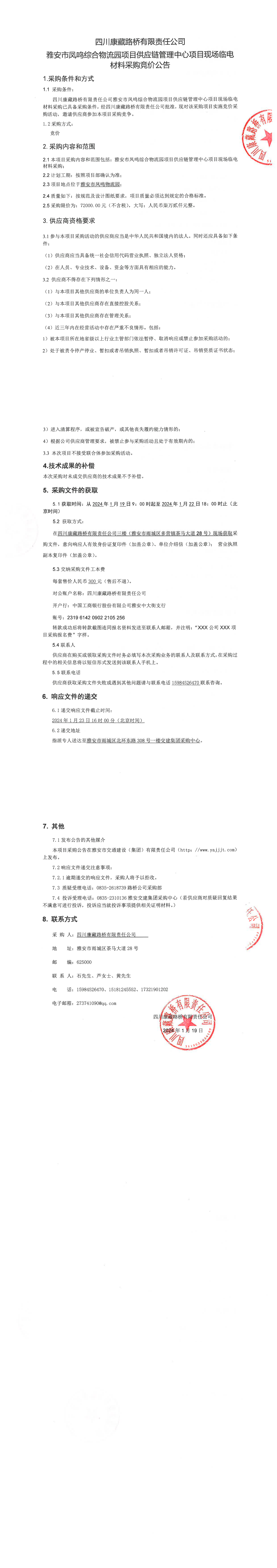四川康藏路橋有限責任公司雅安市鳳鳴綜合物流園項目供應鏈管理中心項目現場臨電材料采購競價公告