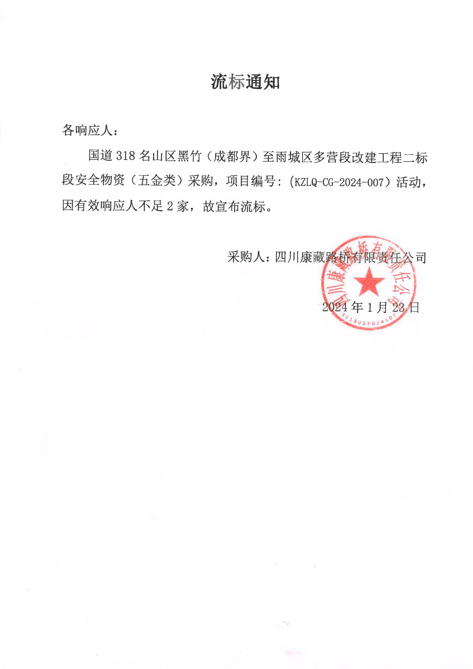 四川康藏路橋有限責任公司國道318名山區(qū)黑竹(成都界)至雨城區(qū)多營段改建工程二標段安全物資(五金類)采購流標通知
