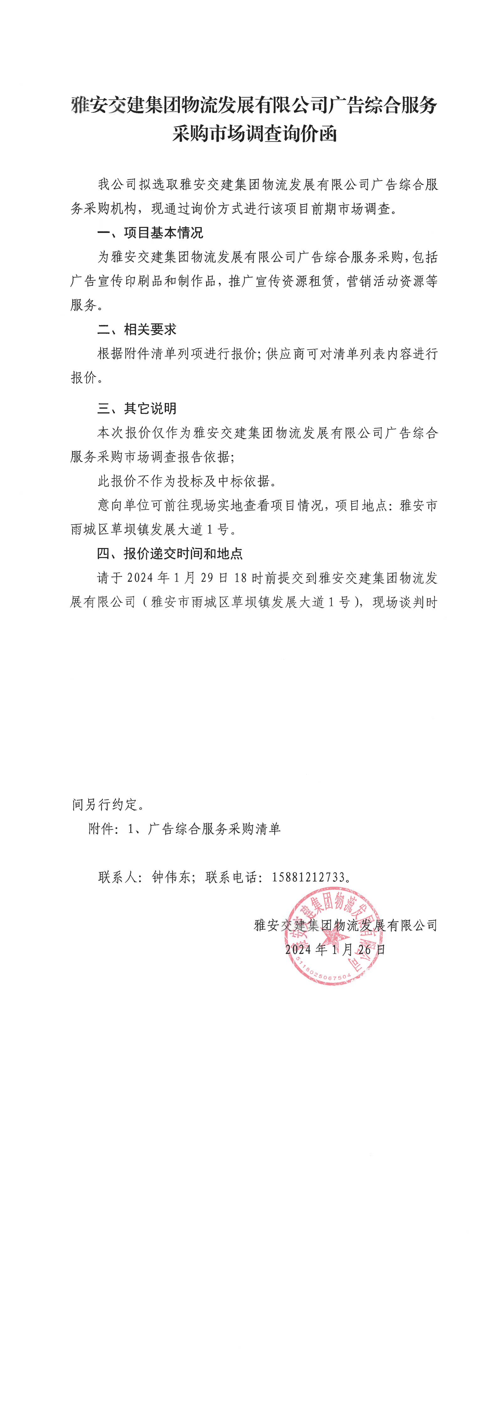 雅安交建集團(tuán)物流發(fā)展有限公司廣告綜合服務(wù)采購市場調(diào)查詢價函