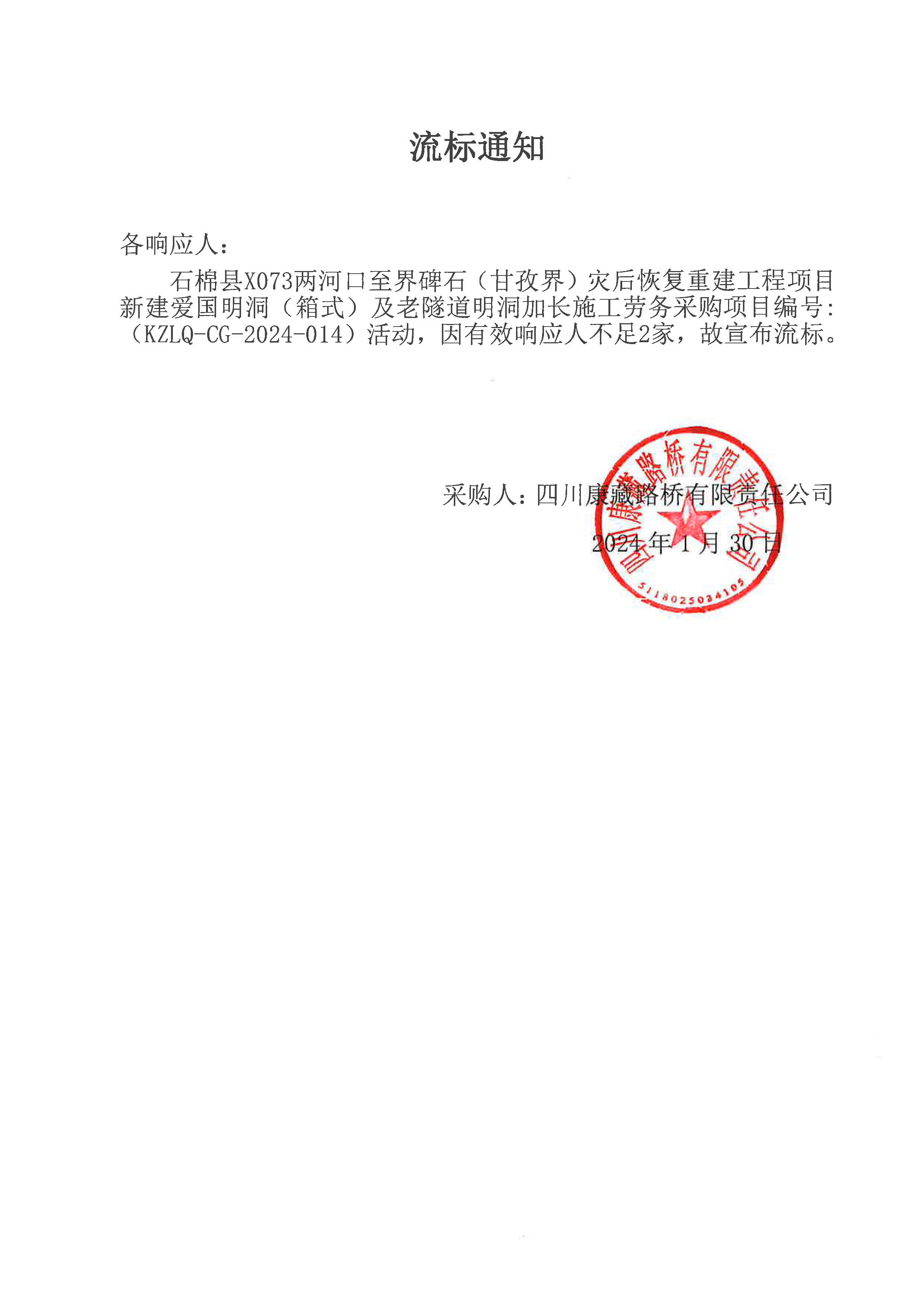 四川康藏路橋有限責(zé)任公司石棉縣X073兩河口至界碑石 (甘孜界)災(zāi)后恢復(fù)重建工程項(xiàng)目新建愛國明洞(箱式)及老隧道明洞加長(zhǎng)施工勞務(wù)流標(biāo)通知