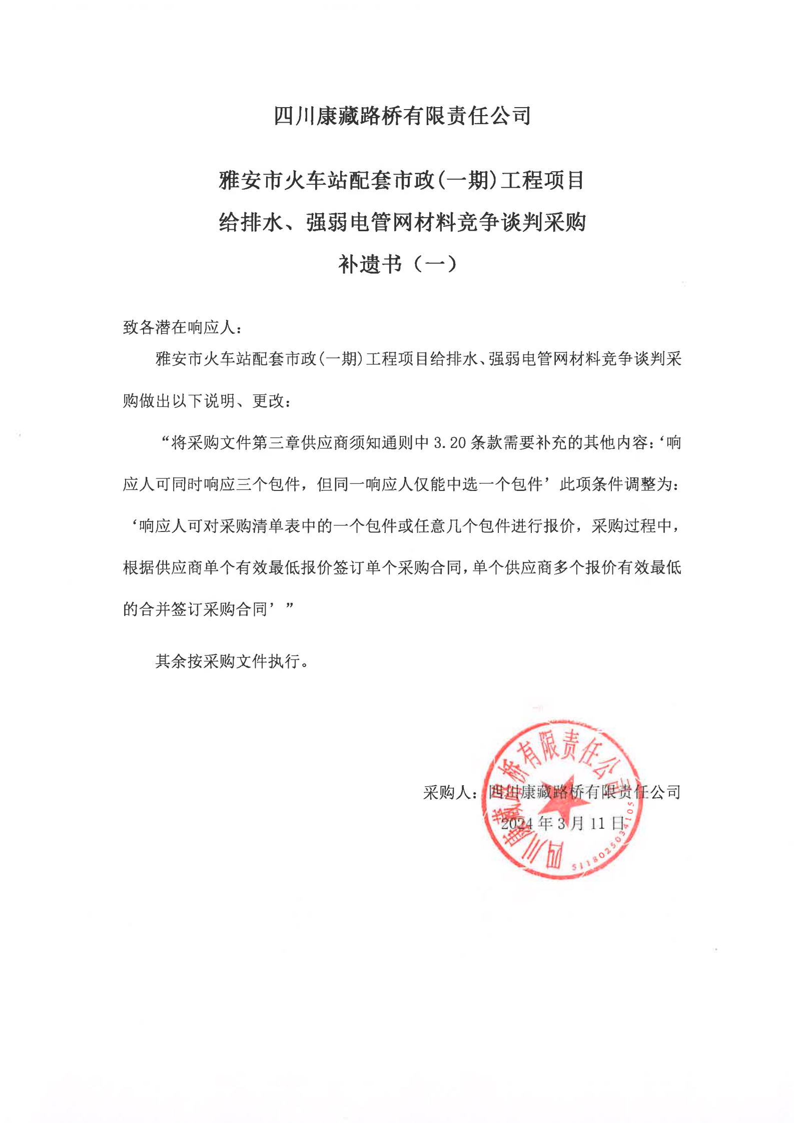 四川康藏路橋有限責(zé)任公司雅安市火車站配套市政(一期)工程項目給排水、強弱電管網(wǎng)材料競爭談判采購補遺書