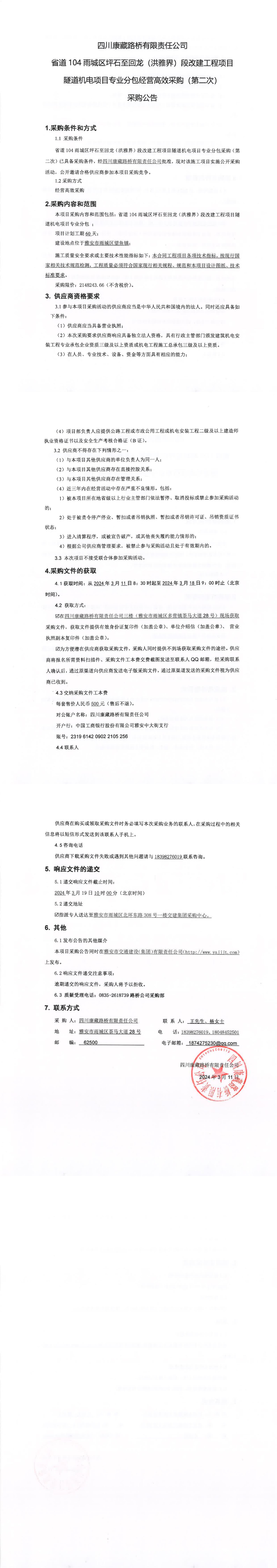 四川康藏路橋有限責(zé)任公司省道104雨城區(qū)坪石至回龍(洪雅界)段改建工程項(xiàng)目隧道機(jī)電項(xiàng)目專(zhuān)業(yè)分包經(jīng)營(yíng)高效采購(gòu)(第二次)采購(gòu)公告
