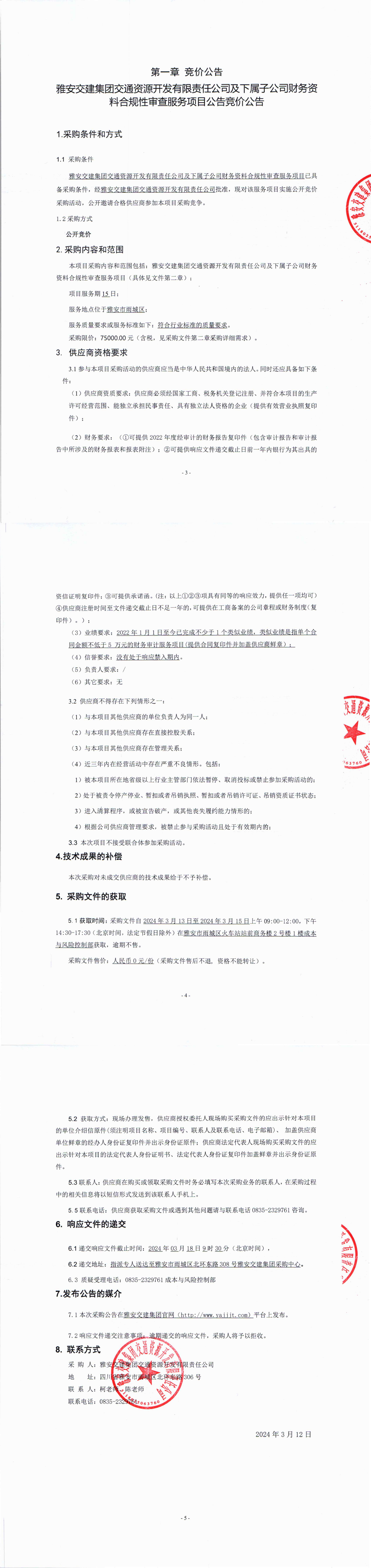 雅安交建集團交通資源開發(fā)有限責(zé)任公司及下屬子公司財務(wù)資料合規(guī)性審查服務(wù)項目公告競價公告