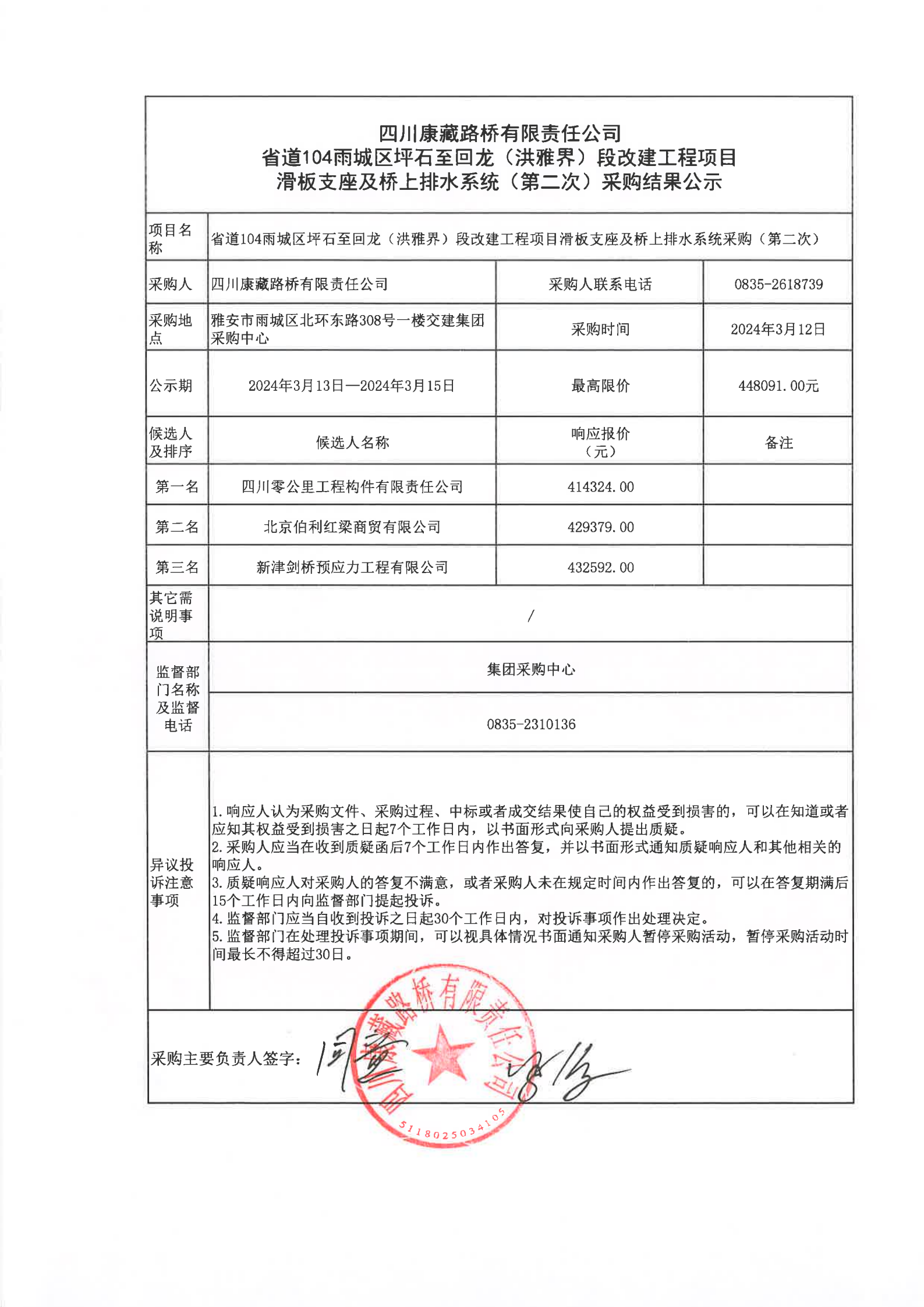 四川康藏路橋有限責(zé)任公司省道104雨城區(qū)坪石至回龍(洪雅界)段改建工程項(xiàng)目滑板支座及橋上排水系統(tǒng)(第二次)采購結(jié)果公示