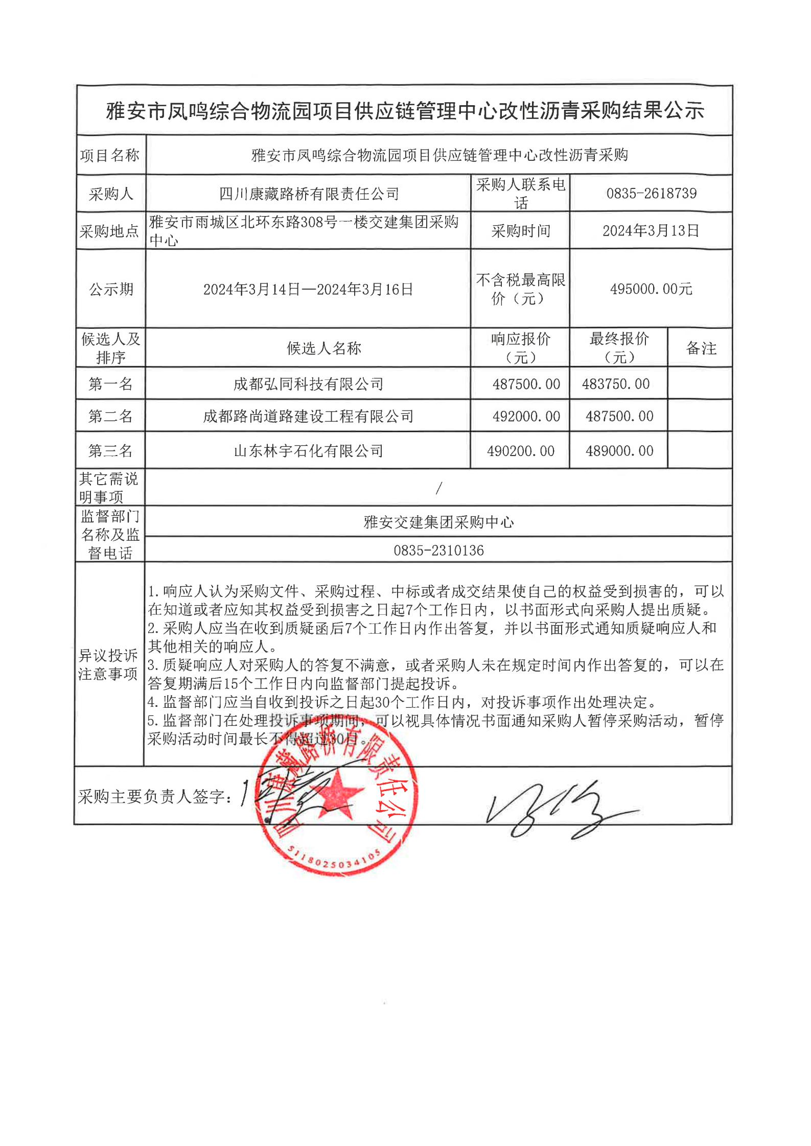 四川康藏路橋有限責任公司雅安市鳳鳴綜合物流園項目供應鏈管理中心改性瀝青采購結(jié)果公示