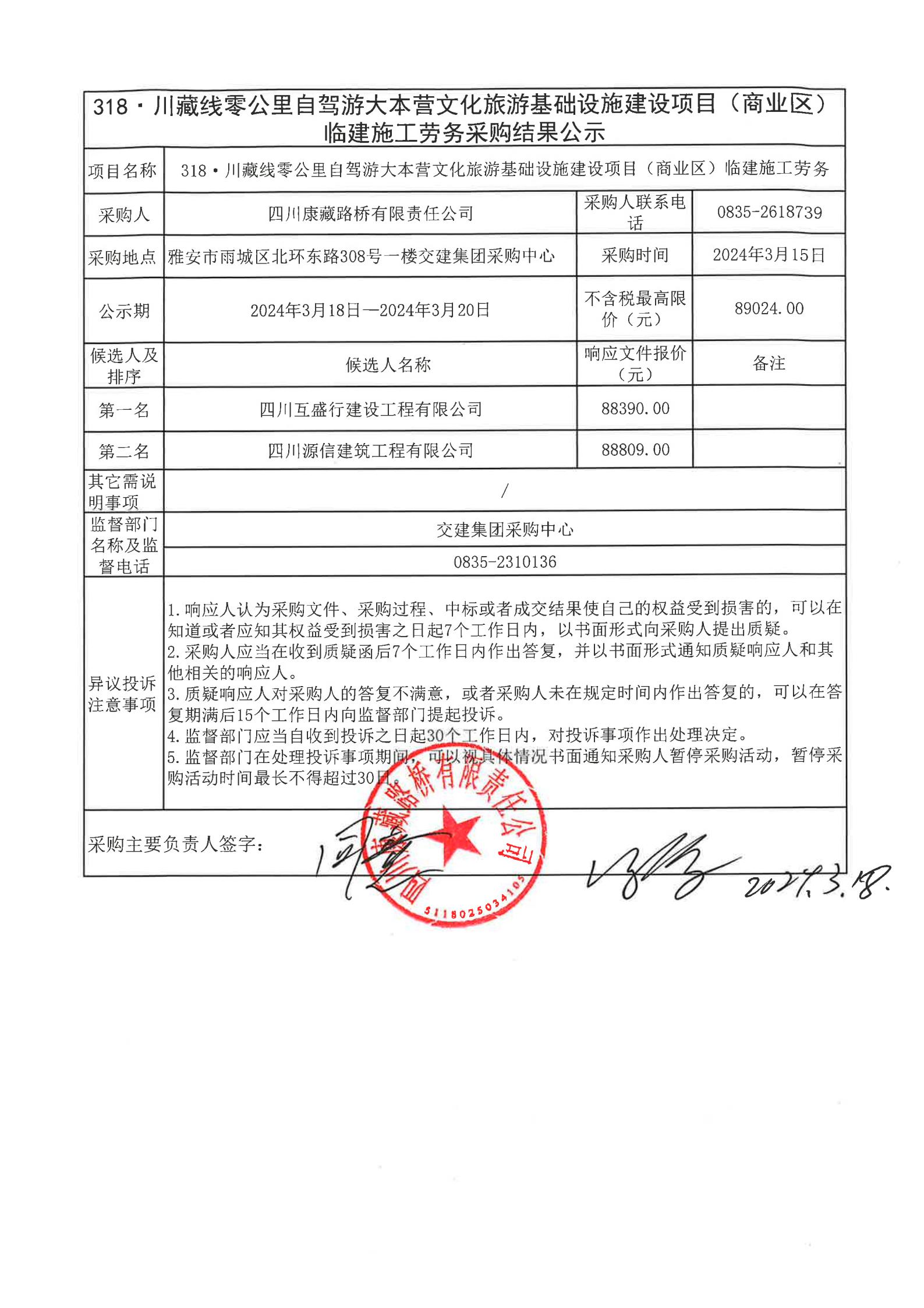 四川康藏路橋有限責任公司318·川藏線零公里自駕游大本營文化旅游基礎設施建設項目(商業(yè)區(qū))臨建施工勞務結果公示