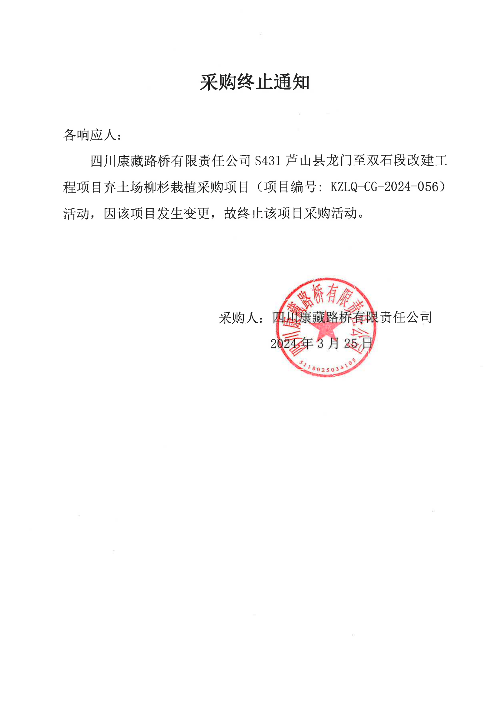 四川康藏路橋有限責任公司S431蘆山縣龍門鎮(zhèn)至雙石段改建工程項目棄土場柳杉載植采購終止通知