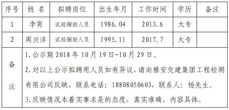 雅安交建集團(tuán)工程檢測有限公司擬聘用人員公示