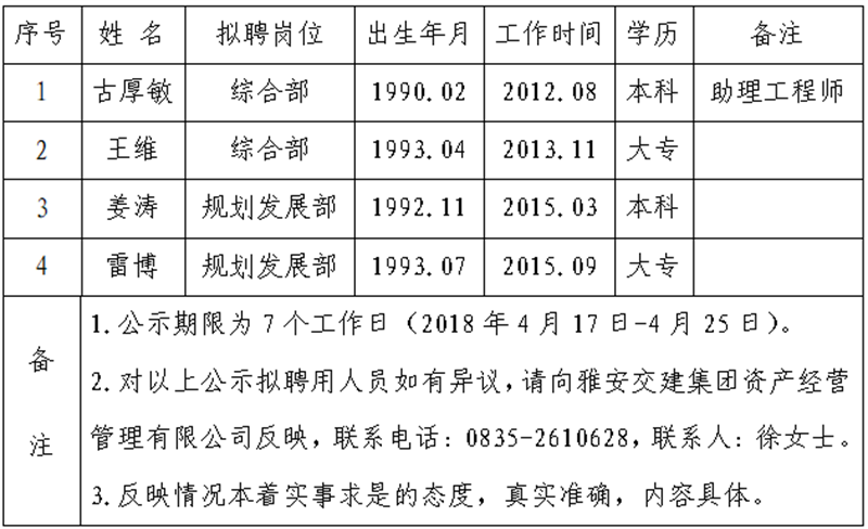 通過公開報名、資格審查、面試等程序,經(jīng)雅安交建集團資產(chǎn)經(jīng)營管理有限公司研究擇優(yōu)確定以下4名擬聘用人員,現(xiàn)公示名單如下: