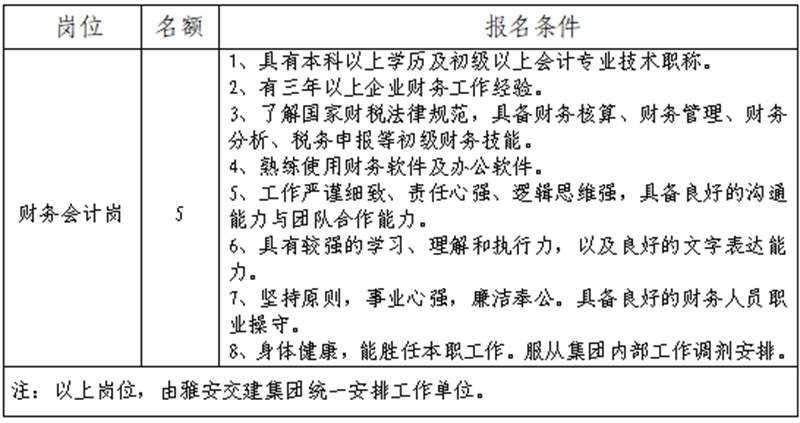 雅安市交通建設(shè)(集團(tuán))有限責(zé)任公司所屬子公司財(cái)務(wù)人員招聘公告