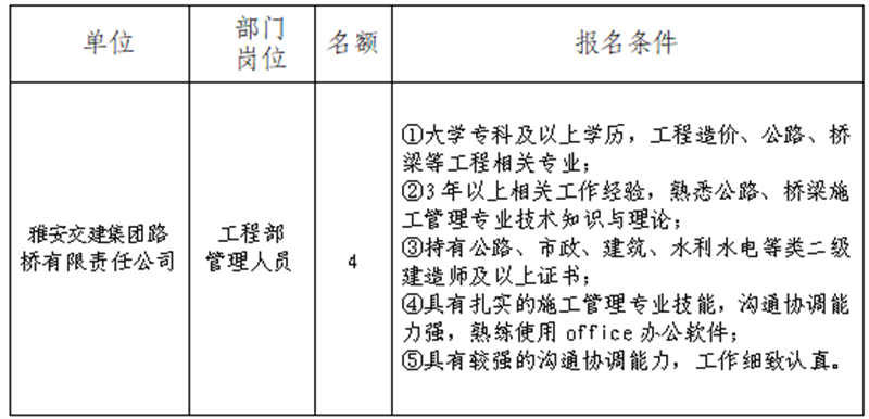 根據(jù)發(fā)展需要,決定面向社會公開招聘雅安市交通建設(shè)(集團)有限責(zé)任公司(以下簡稱雅安交建集團)所屬子公司工作人員4名,現(xiàn)將有關(guān)事項公告如下: