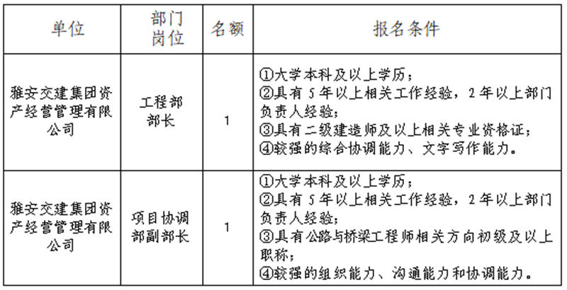 根據(jù)發(fā)展需要,決定面向社會公開招聘雅安市交通建設(集團)有限責任公司(以下簡稱“雅安交建集團”)所屬子公司工作人員2名,現(xiàn)將有關事項公告如下: