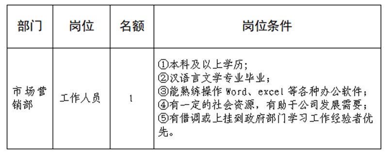 根據(jù)發(fā)展需要,決定面向社會(huì)公開招聘雅安市交通建設(shè)(集團(tuán))有限責(zé)任公司(以下簡(jiǎn)稱“雅安交建集團(tuán)”)所屬子公司工作人員1名,現(xiàn)將有關(guān)事項(xiàng)公告如下: