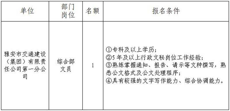 根據(jù)發(fā)展需要,決定面向社會(huì)公開(kāi)招聘雅安市交通建設(shè)(集團(tuán))有限責(zé)任公司(以下簡(jiǎn)稱雅安交建集團(tuán))所屬公司工作人員1名,現(xiàn)將有關(guān)事項(xiàng)公告如下: