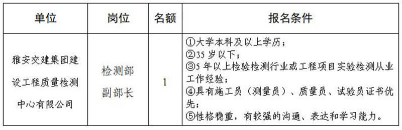 雅安交建集團關于公開招聘所屬子公司工作人員的公告(工程檢測中心)