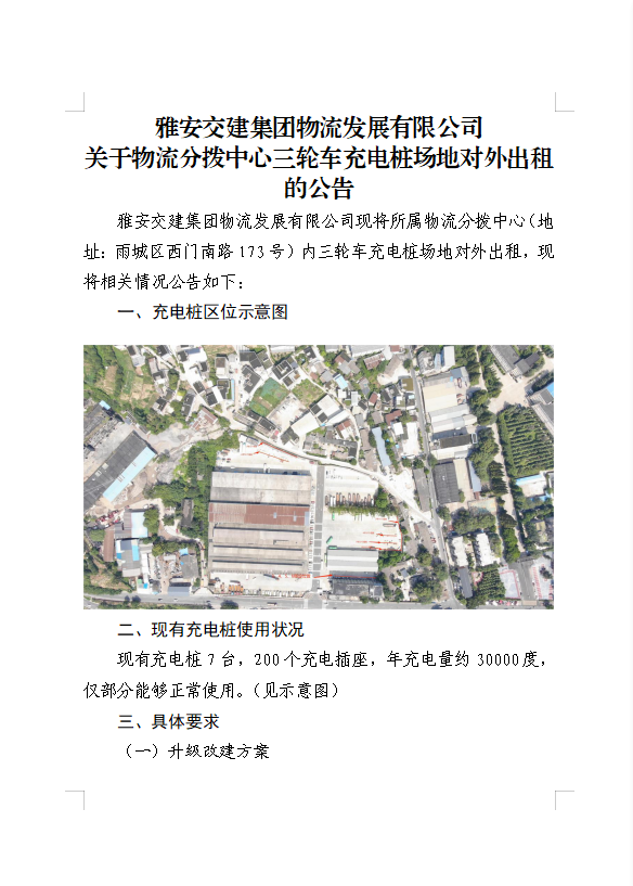 雅安交建集團物流發(fā)展有限公司關于物流分撥中心三輪車充電樁場地對外出租的公告