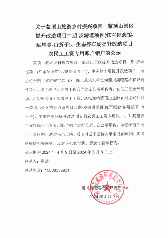 關(guān)于蒙頂山旅游鄉(xiāng)村振興項(xiàng)目一蒙頂山景區(qū)提升改造項(xiàng)目二期-步游道項(xiàng)目(紅軍紀(jì)念館遠(yuǎn)望亭-山折子)、生態(tài)停車(chē)場(chǎng)提升改造項(xiàng)目農(nóng)民工工資專(zhuān)用賬戶(hù)銷(xiāo)戶(hù)的公示