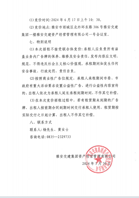 雅安交建集團資產(chǎn)經(jīng)營管理有限公司關(guān)于戶外廣告位競價招租的公告