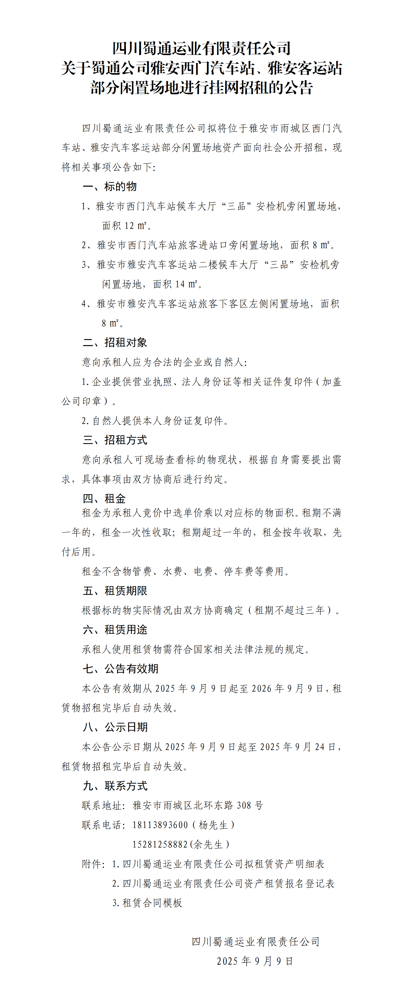四川蜀通運(yùn)業(yè)有限責(zé)任公司 關(guān)于蜀通公司雅安西門(mén)汽車(chē)站、雅安客運(yùn)站部分閑置場(chǎng)地進(jìn)行掛網(wǎng)招租的公告