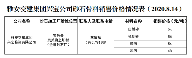 雅安交建集團(tuán)興寶公司砂石骨料銷售價(jià)格情況表(2020.8.14)