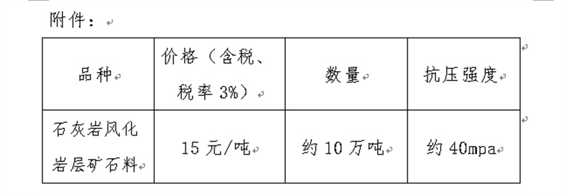 現(xiàn)將我公司礦山首采平臺的石灰?guī)r風化巖層礦石料定價出售事宜進行公示(見附件),經公司研究決定,定價出售風化巖層礦石料約10萬噸,現(xiàn)通過集團公司官網信息公示后對外銷售。報名客戶數(shù)不限,銷售方式為先款后貨,簽約銷售,銷售時間以礦山開采和生產計劃為準。