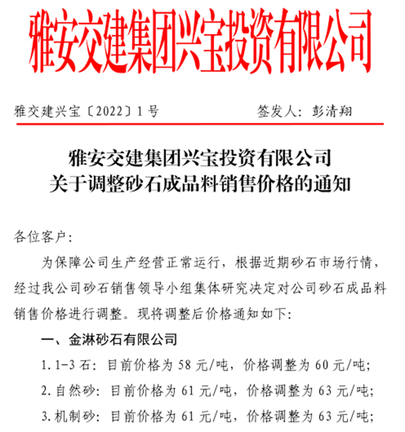雅安交建集團丹石公司關(guān)于調(diào)整砂石成品骨料銷售價格的通知(2022.1.5)