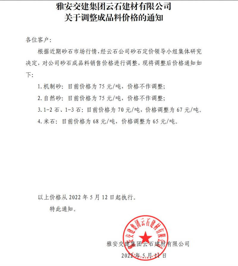 雅安交建云石建材有限公司調(diào)價(jià)通知-2022-5-12