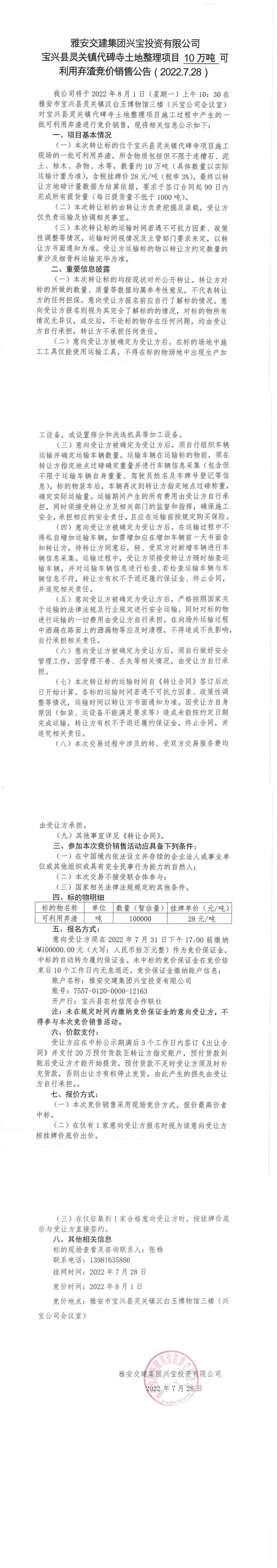 雅安交建集團興寶投資有限公司靈關鎮(zhèn)代碑寺土地整理項目5萬噸可利用棄渣競價銷售公告(2022.7.28)