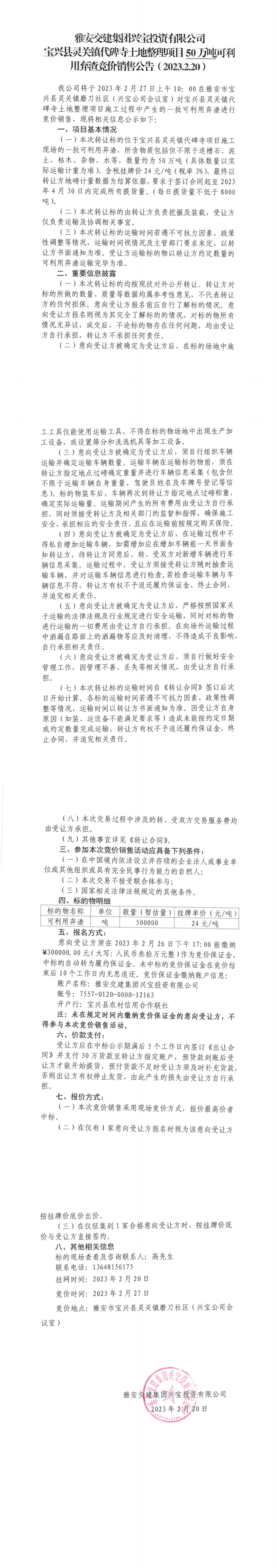 雅安交建集團(tuán)興寶投資有限公司靈關(guān)鎮(zhèn)代碑寺土地整理項(xiàng)目50萬噸可利用棄渣競(jìng)價(jià)銷售公告(2023.2.20)、